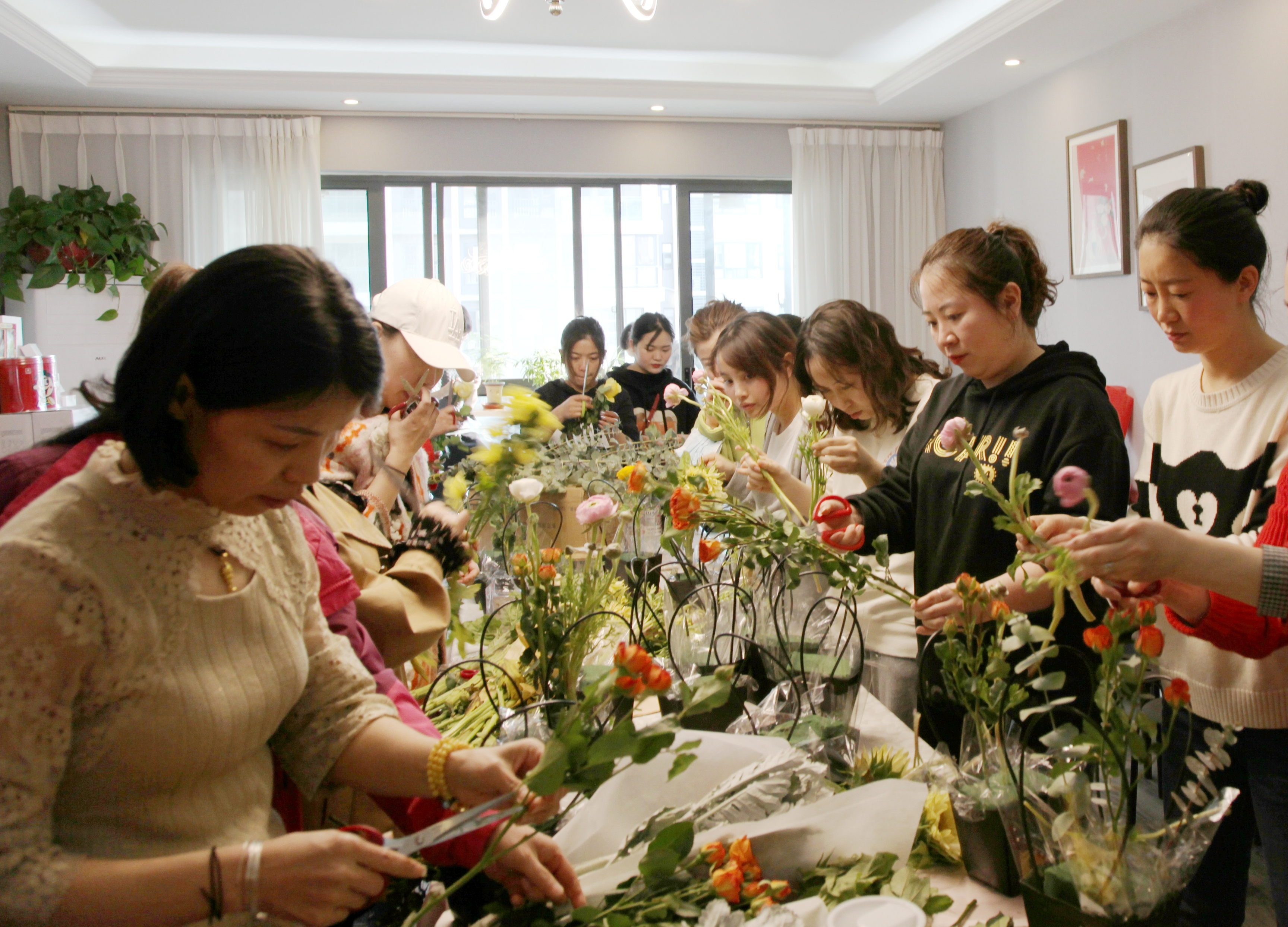 隨后女職工們充分發(fā)揮想象力和創(chuàng)造力,精心選配鮮花、修剪枝葉、整理花朵,一盆盆錯(cuò)落有致、色彩鮮艷、造型別致的插花作品相繼出爐,活動(dòng)現(xiàn)場(chǎng)花香四溢、歡聲笑語(yǔ)、其樂(lè)融融。